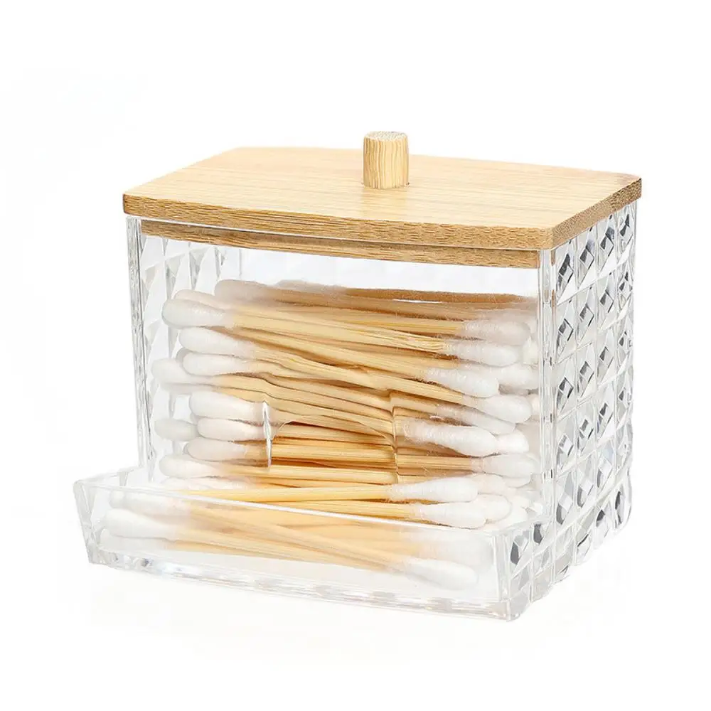 Acrylic Cotton Swab Holder with Bamboo Lid - Clear Cotton Swab Dispenser Bathroom Container Cotton Swab Canister